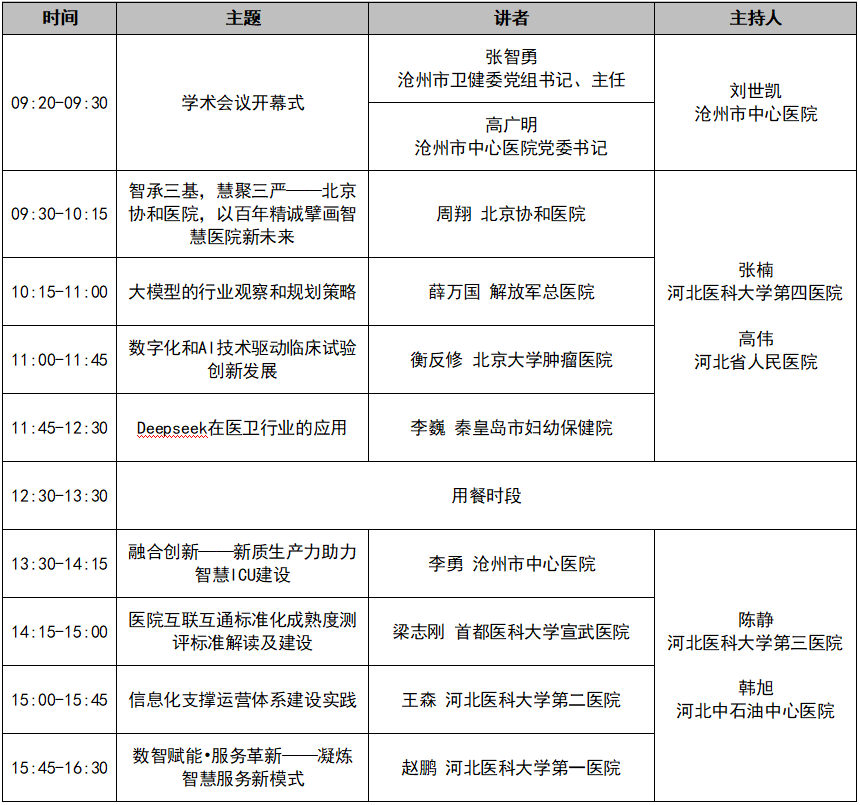 主办单位: 河北省医院管理学会 承办单位: 沧州市中心医院 (一)河北省医院管理学会有关领导; (二)国内及省内医院卫生健康信息化管理领域知名专家和学者; (三)沧州市卫生健康委、沧州市中心医院领导; (四)河北省医院管理学会医疗信息化与人工智能专业委员会拟任主任委员、副主任委员、常务委员、委员、秘书长、副秘书长; (五)其他相关领域嘉宾、代表。 成立大会日程安排 报到时间: 2025年11月13日14:00—18:00 2025年11月14日08:00—08:30 注:报到请携带纸质版委员申请表 会议时间:2025年11月14日08:30—16:30 会议地点:沧州市中心医院会议中心学术报告厅(河北省沧州市浮阳南大道6号) 本次会议免收注册费,会议期间交通及住宿费用自理,住宿费按照酒店标准由入住酒店开具发票,会议不安排接送服务,请自行安排前往。以下为推荐酒店信息,请有意向入住的参会代表自行联系酒店预订,报会议名称,享会议协议价: (一)桔子酒店 地址:沧州市浮阳南大道11号(距会场距离约0.6公里) 酒店电话:0317-3201234 价格:280元(含早餐),共89间房 (二)尚客优品酒店(沧州中心医院店) 地址:河北省沧州市浮阳南大道4号(距会场距离约0.3公里) 酒店电话:0317-2181666 价格:159元(含早餐),共40间房 (三)大运河迎宾馆 地址:河北省沧州市永济东路21号(距会场距离约4.0公里) 酒店电话:15226745403(吕经理) 价格:350元(含早餐) 胡胜利:15903175860 李伊瑒:0317-2072668